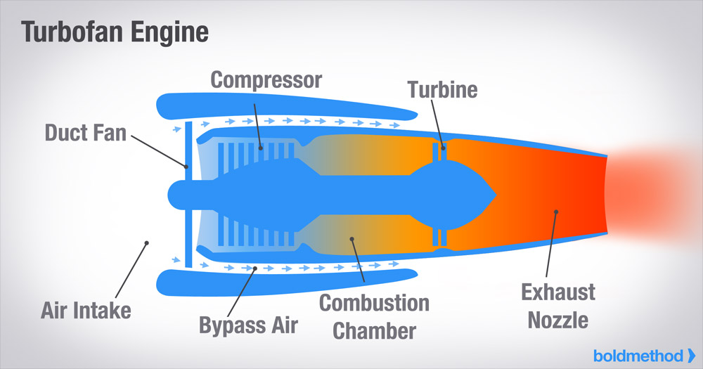 The compressor compresses the air coming in the engine’s intake, increasing its pressure. The compressed air, now moving quickly through the engine, is combusted, meaning that it gets mixed with fuel and set alight. The fiery, fast-moving air is then shot out the back through the engine’s exhaust nozzle, providing thrust. There are a multitude of ways to get this process done, and it can be different for each type of engine.